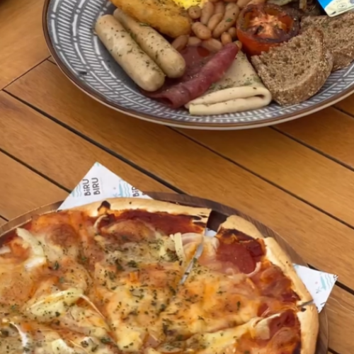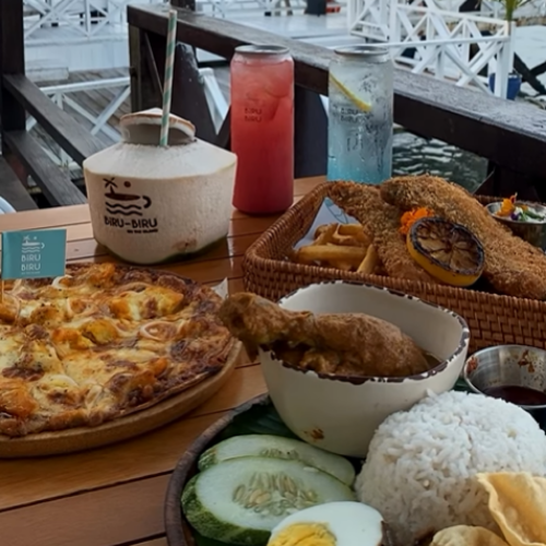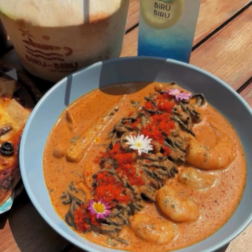 The cafe is famous for its seafront views and "Instagrammable" Balinese décor. Popular menu items include the Blue Lagoon soda, Burnt Cheesecake, and Nasi Lemak.